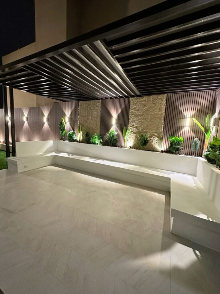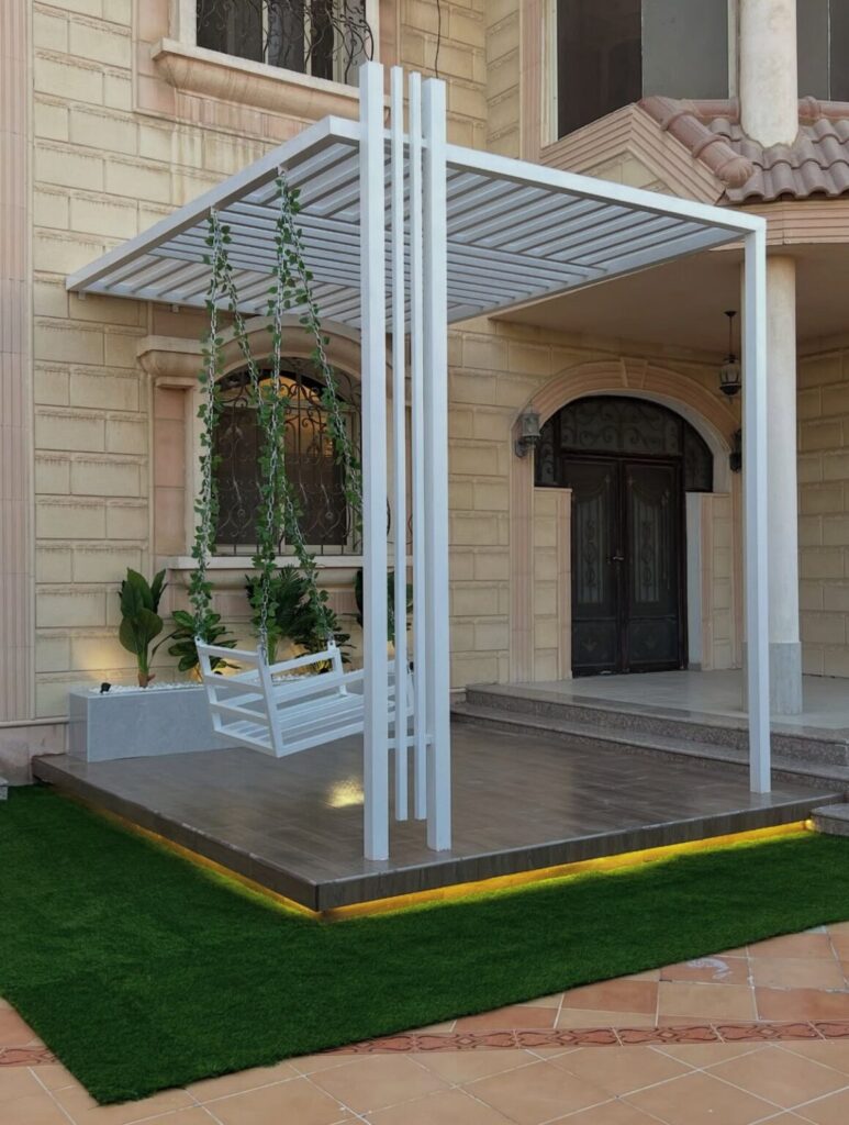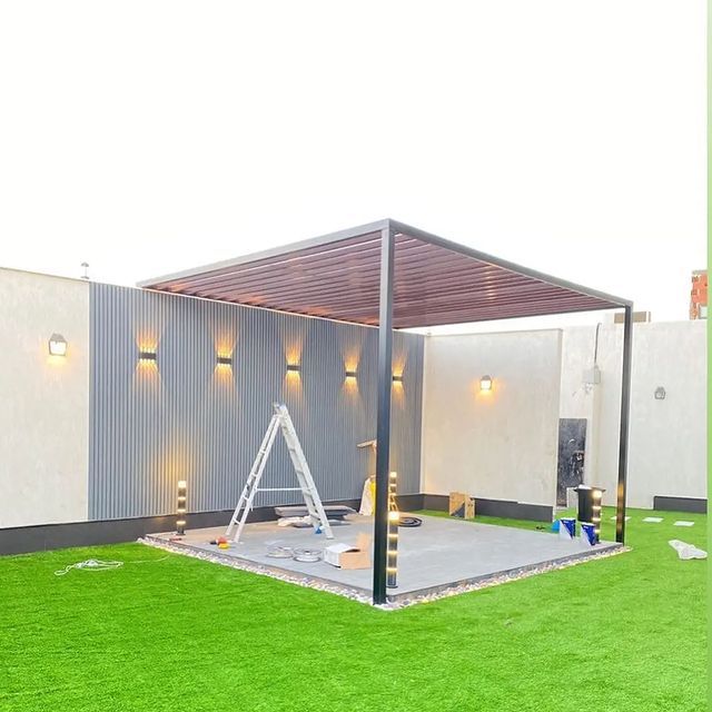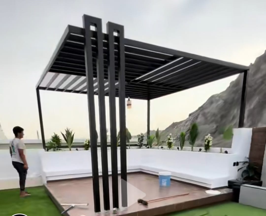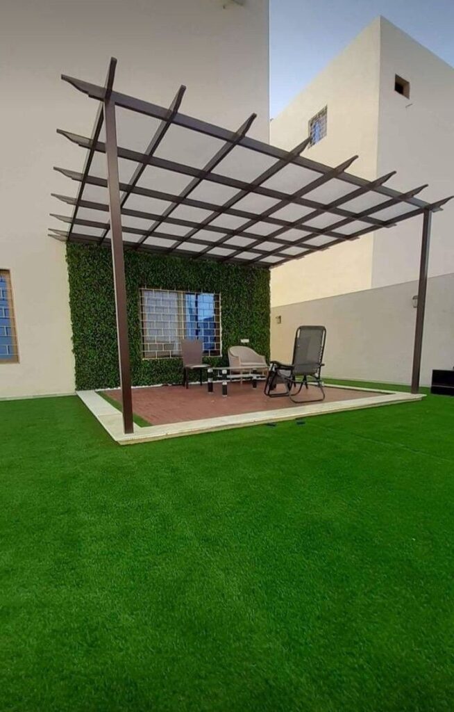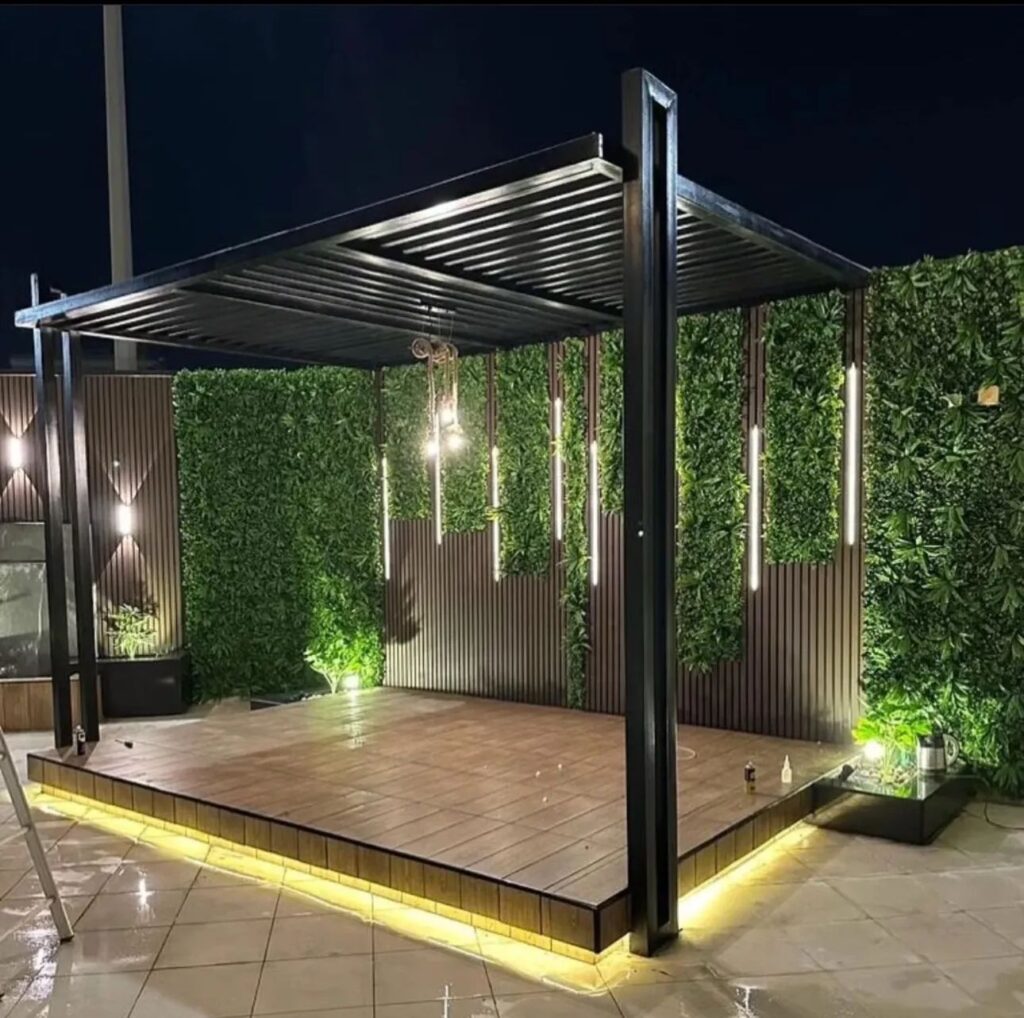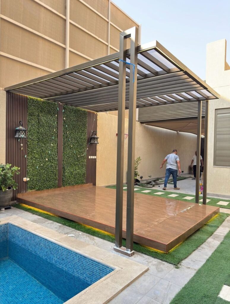 تصميم وتنفيذ المظلات والجلسات الخارجية لتوفير الراحة والظل.