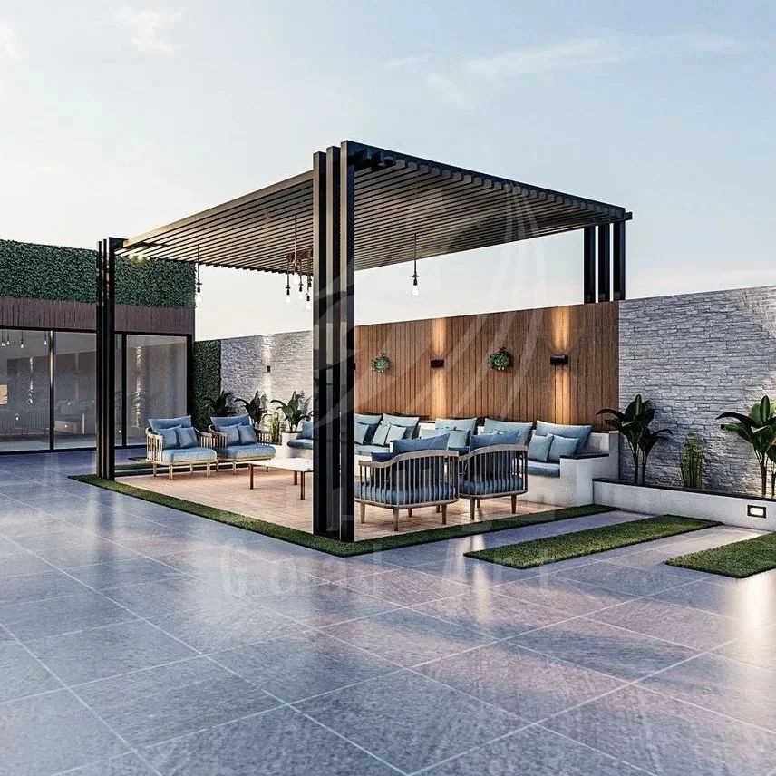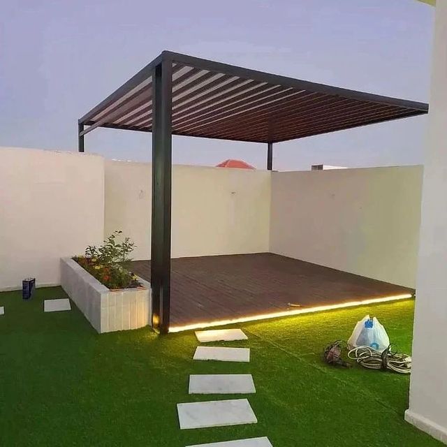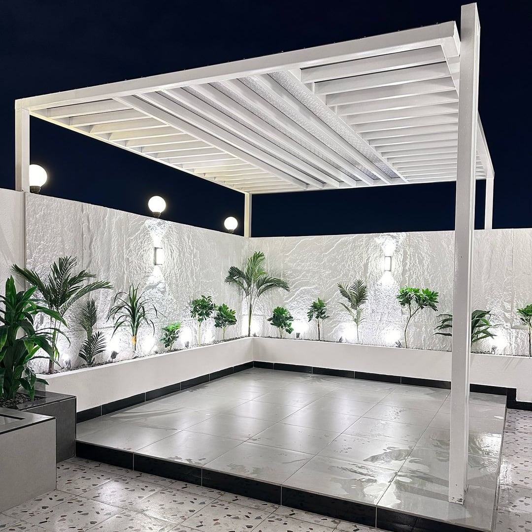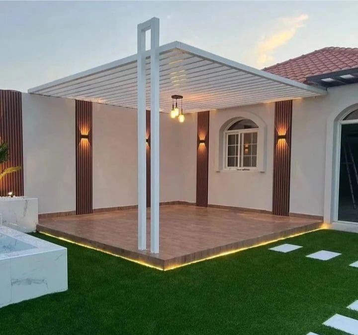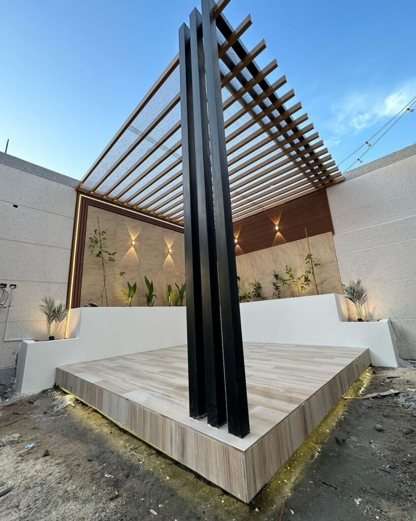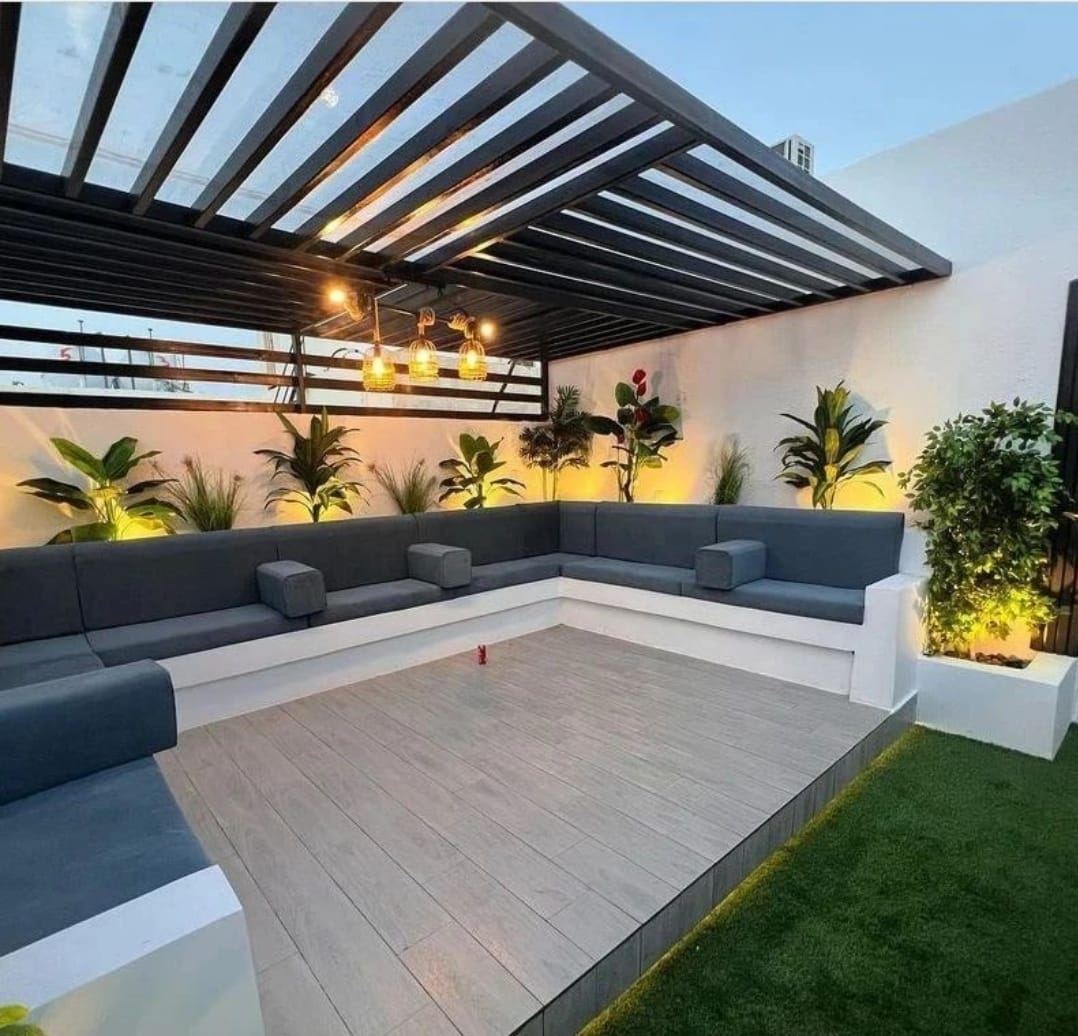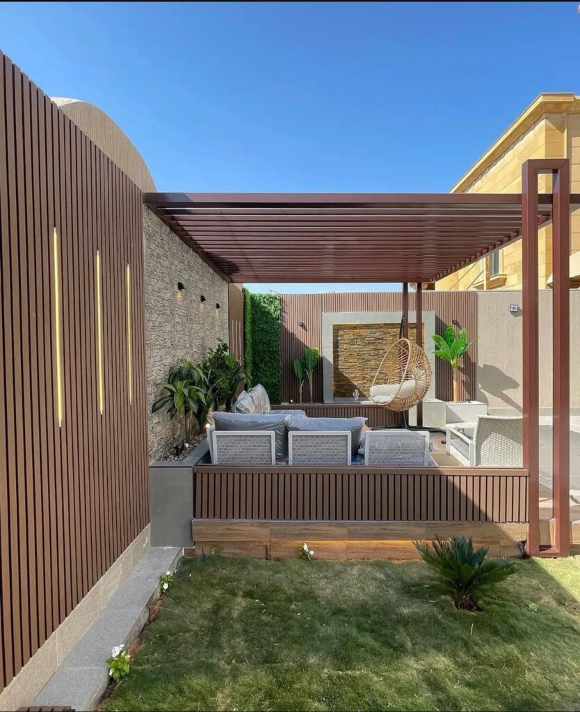 تصميم وتنفيذ المظلات والجلسات الخارجية لتوفير الراحة والظل.