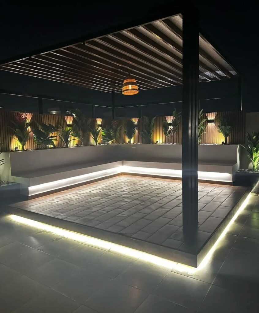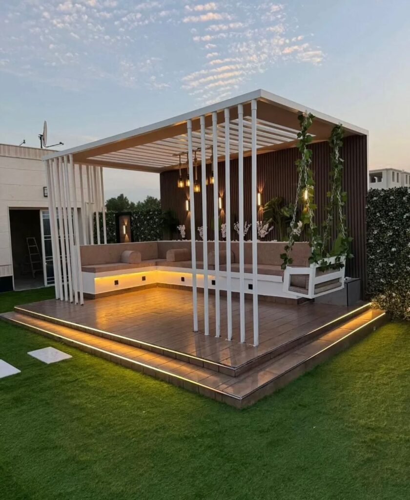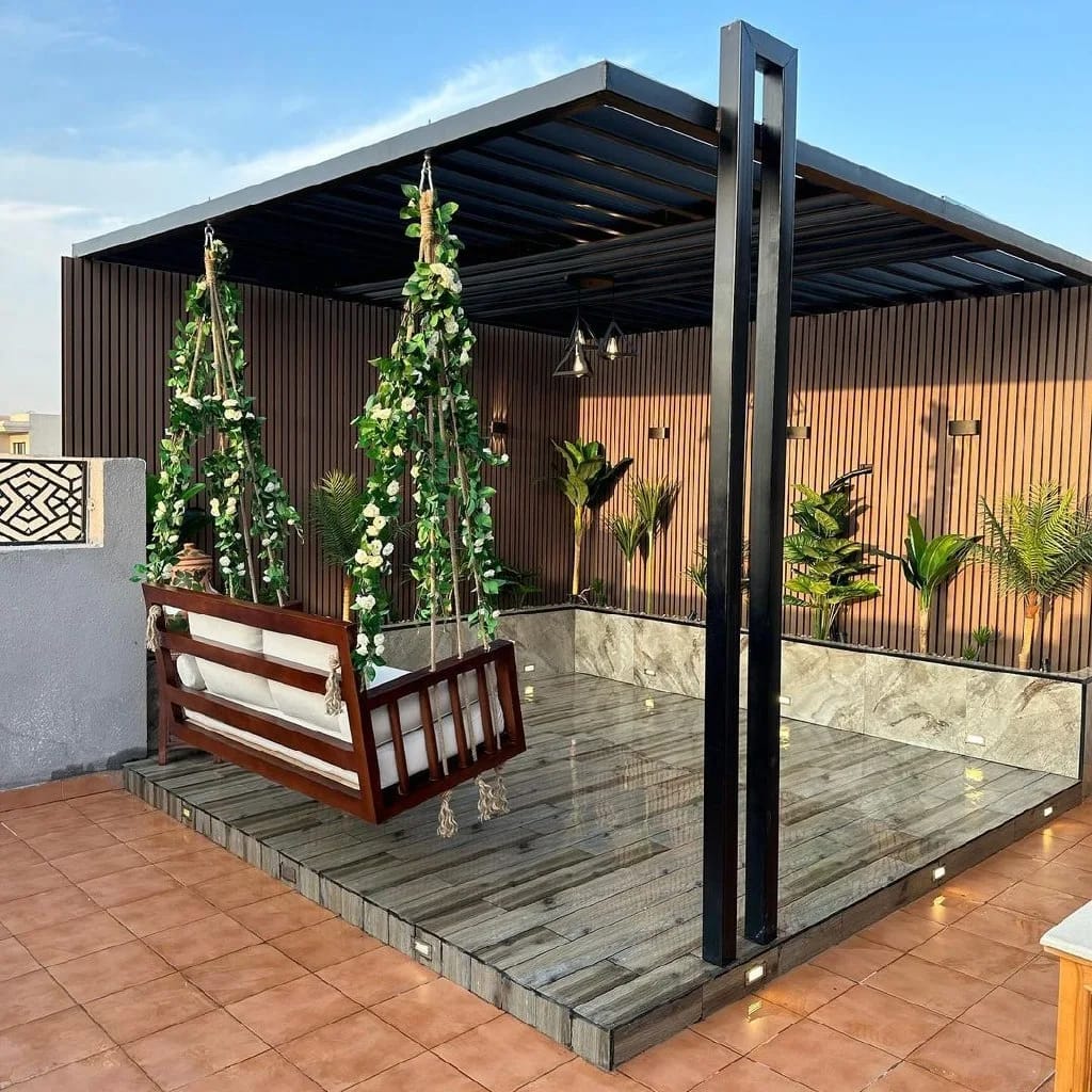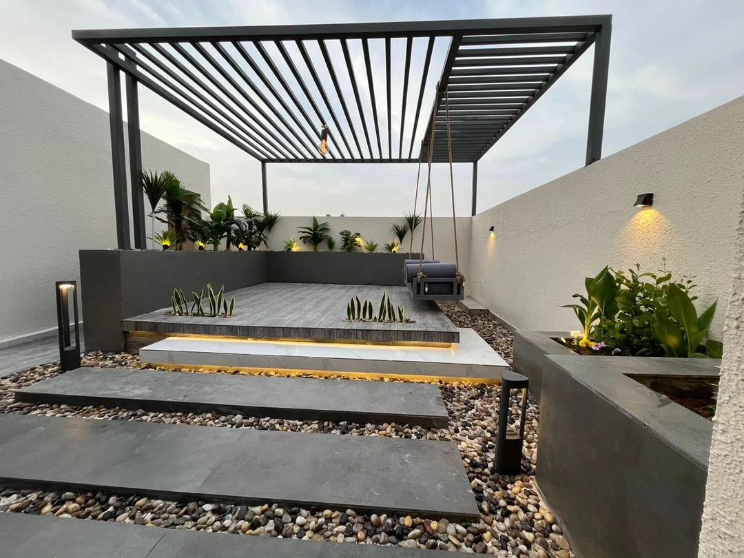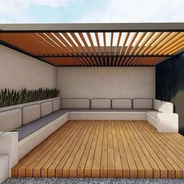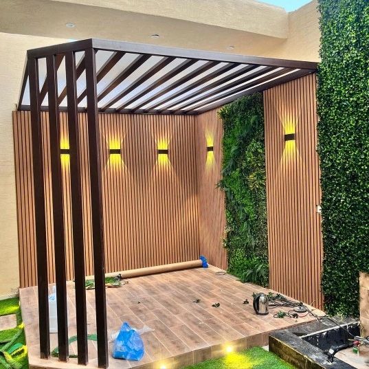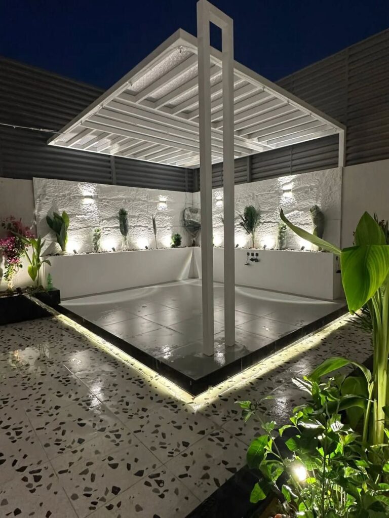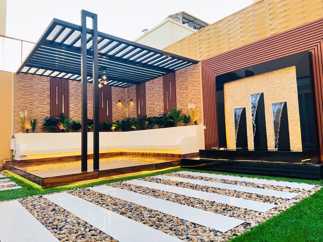 تصميم وتنفيذ المظلات والجلسات الخارجية لتوفير الراحة والظل.