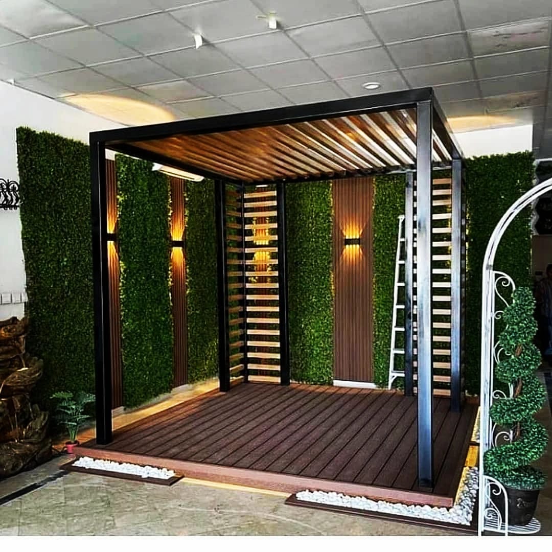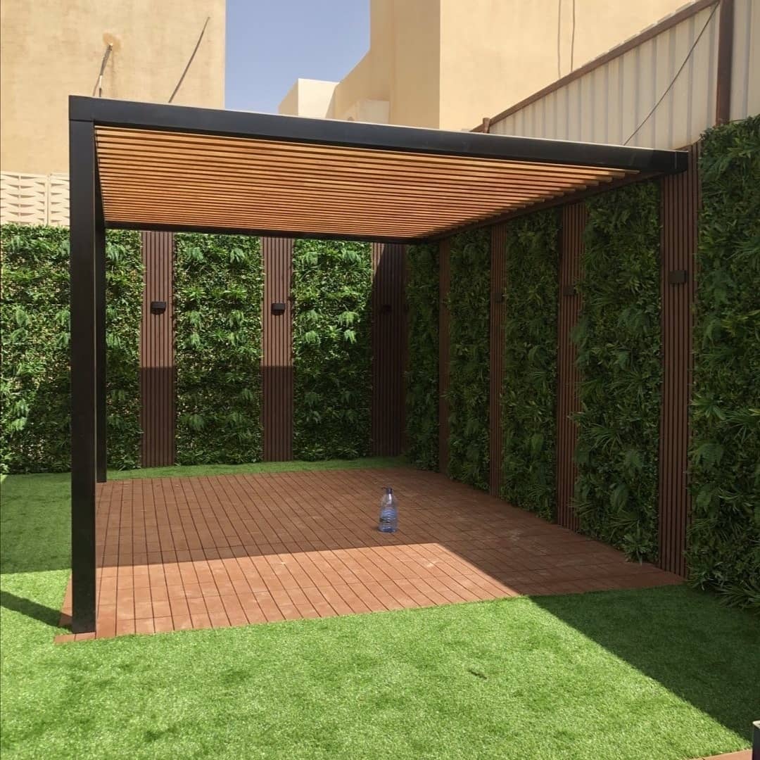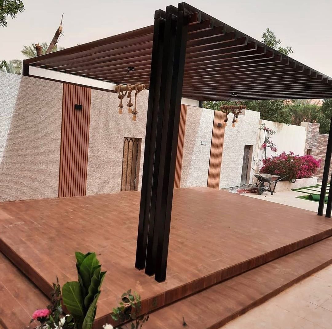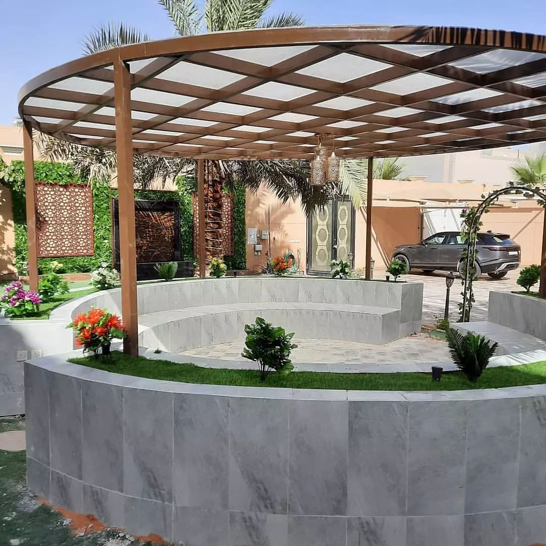 تُصمَّم لتوفير الظل والراحة أثناء الجلوس في الهواء الطلق، وغالبًا ما تُدمج مع جلسات خشبية أو أرضيات خارجية.
