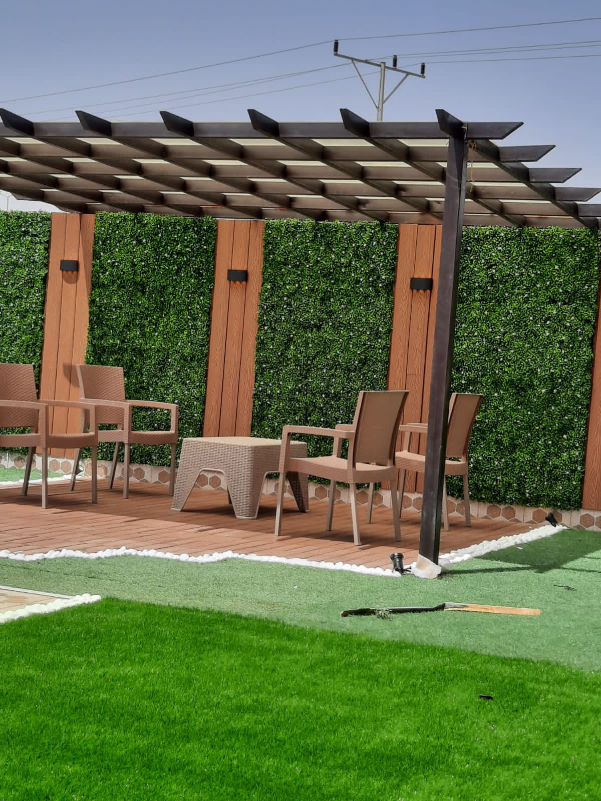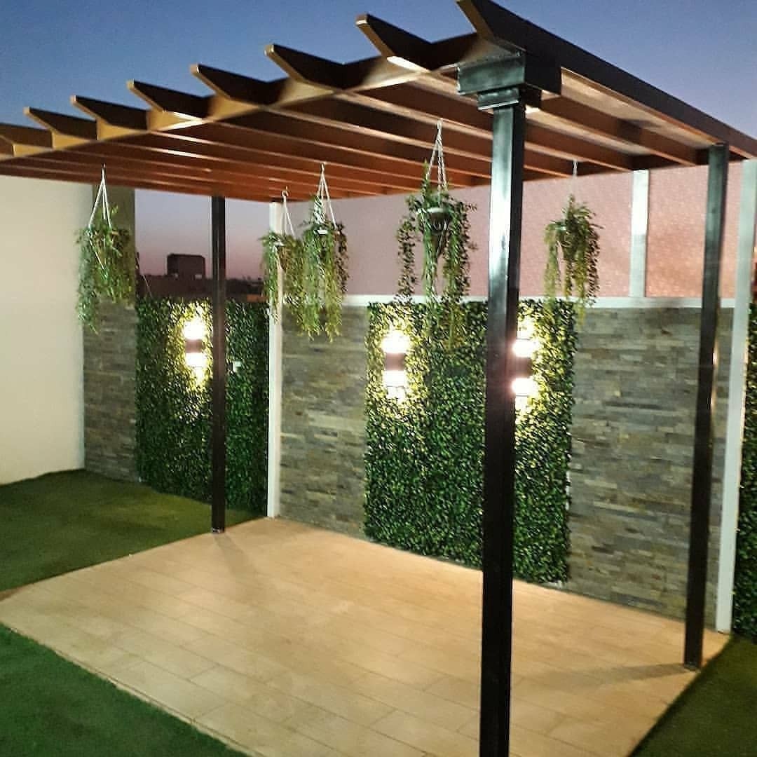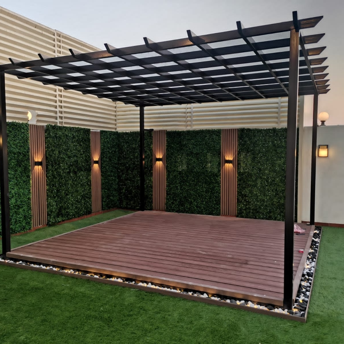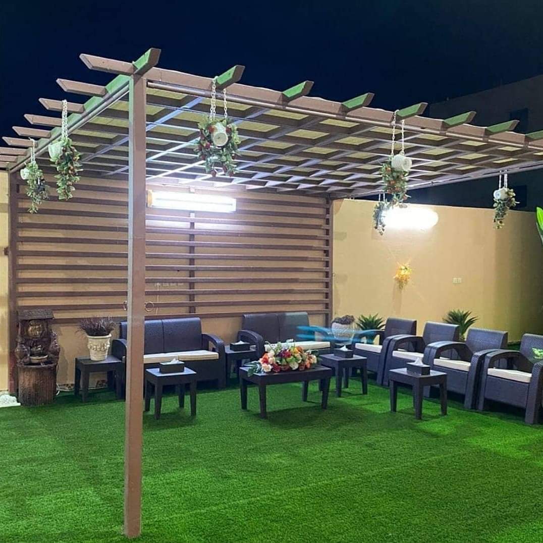 تُصمَّم لتوفير الظل والراحة أثناء الجلوس في الهواء الطلق، وغالبًا ما تُدمج مع جلسات خشبية أو أرضيات خارجية.